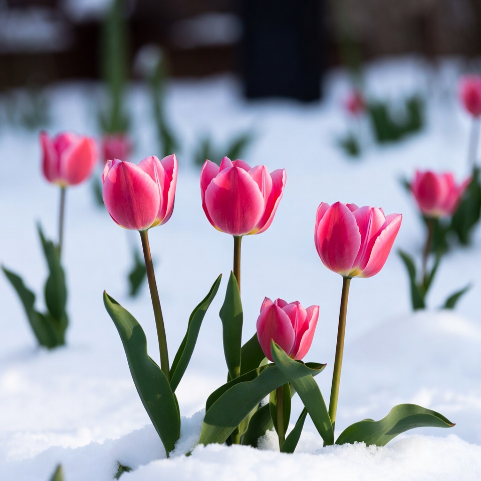 blooming, cold weather, floral, flowers, frosty, garden, green stems, nature, outdoor, petals, pink flowers, plant stems, snow, snow-covered, spring flowers, tulip garden, tulips, white snow, winter, pink tulips