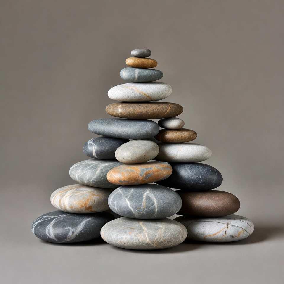 A tall pyramid is meticulously stacked from smooth pebbles of various sizes and colors including gray, white, brown, and orange tones. The stones are balanced precariously on a neutral gray background. The structure resembles a miniature tower or Christmas tree shape.