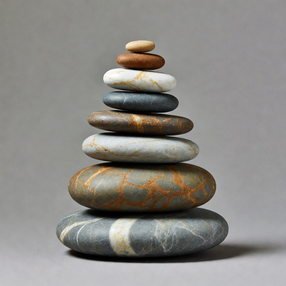 A tall stack of smooth pebbles in various colors including gray, white, brown, and beige forms a balanced tower. The stones have natural textures and veins, arranged from larger at the base to smaller at the top. The composition is centered against a plain gray background.