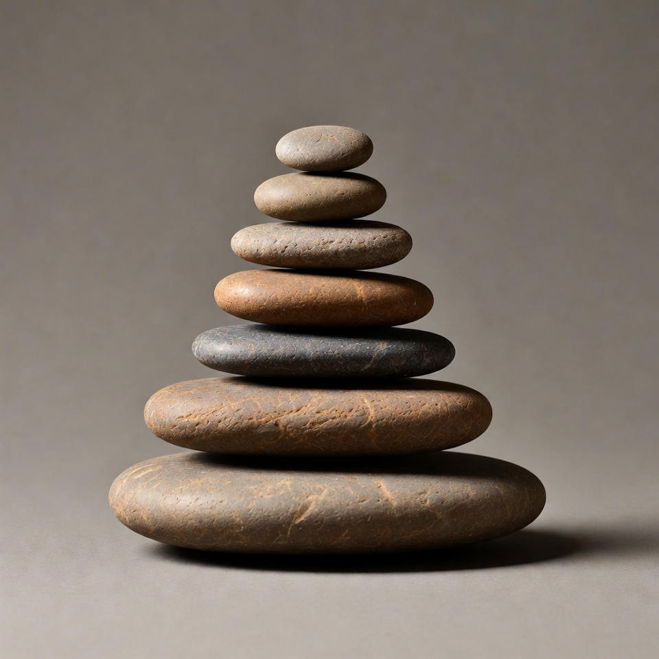 Smooth pebbles of various sizes and earthy tones are meticulously stacked into a tall, conical tower. The structure stands steadily on a neutral gray background with soft lighting creating subtle shadows. Each stone is balanced perfectly on the one below it.
