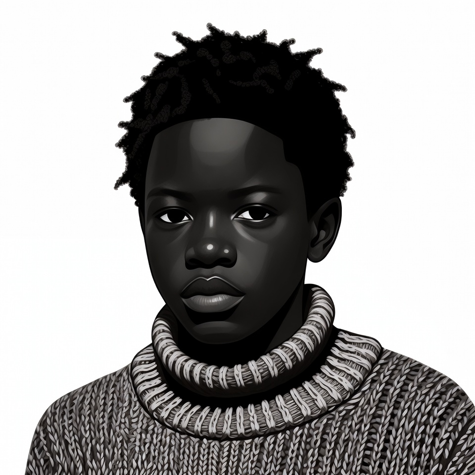 A black and white illustration of a young African boy with curly afro hair faces forward. He wears a detailed knit turtleneck sweater with textured patterns. The image is isolated on a white background.