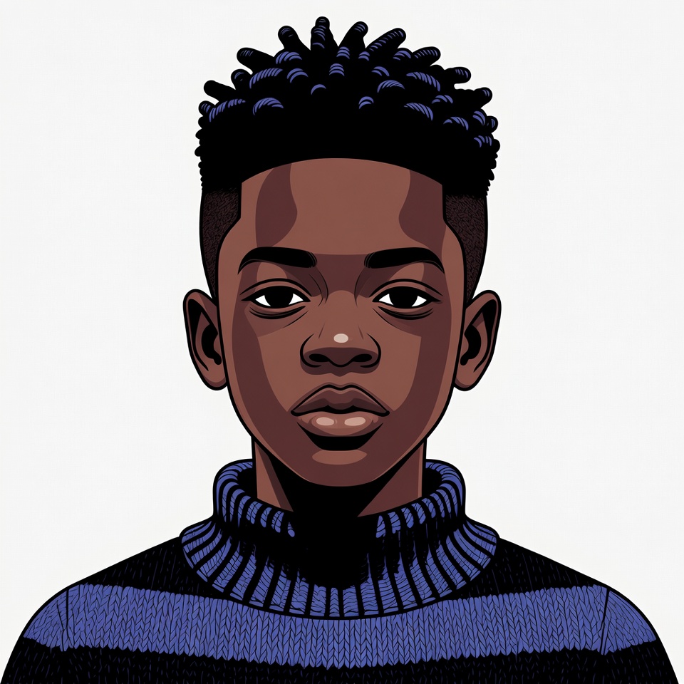 An illustration of a young African-American boy with short curly hair and large expressive eyes. He wears a blue and black striped turtleneck sweater. The portrait is on a white isolated background.