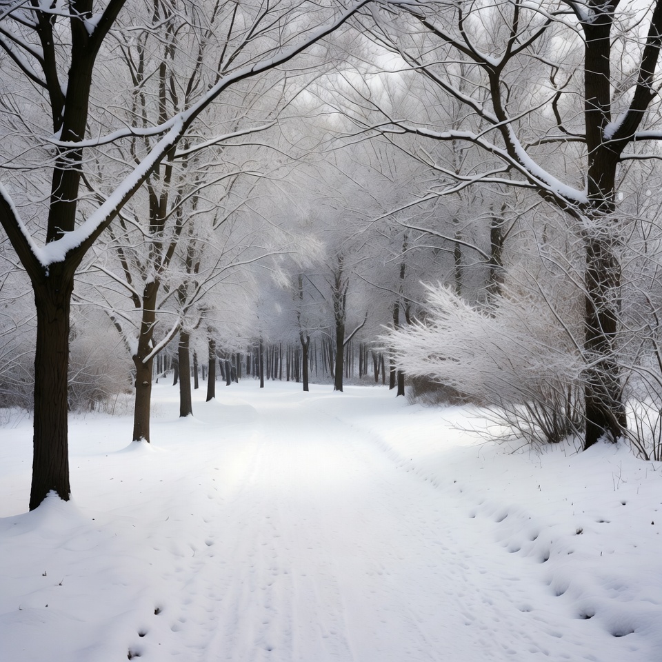 A straight snowy path winds through a forest of tall bare trees covered in snow. The branches arch overhead, creating a tunnel-like effect with fresh snow blanketing the ground and bushes. Footprints are visible along the path in the winter landscape.