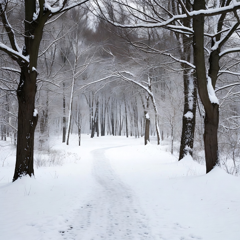 A narrow snowy path winds through a dense forest of tall trees covered in snow. Bare branches arch overhead, blanketed in white powder under a misty gray sky. The ground is fully covered in deep snow with subtle footprints along the trail.