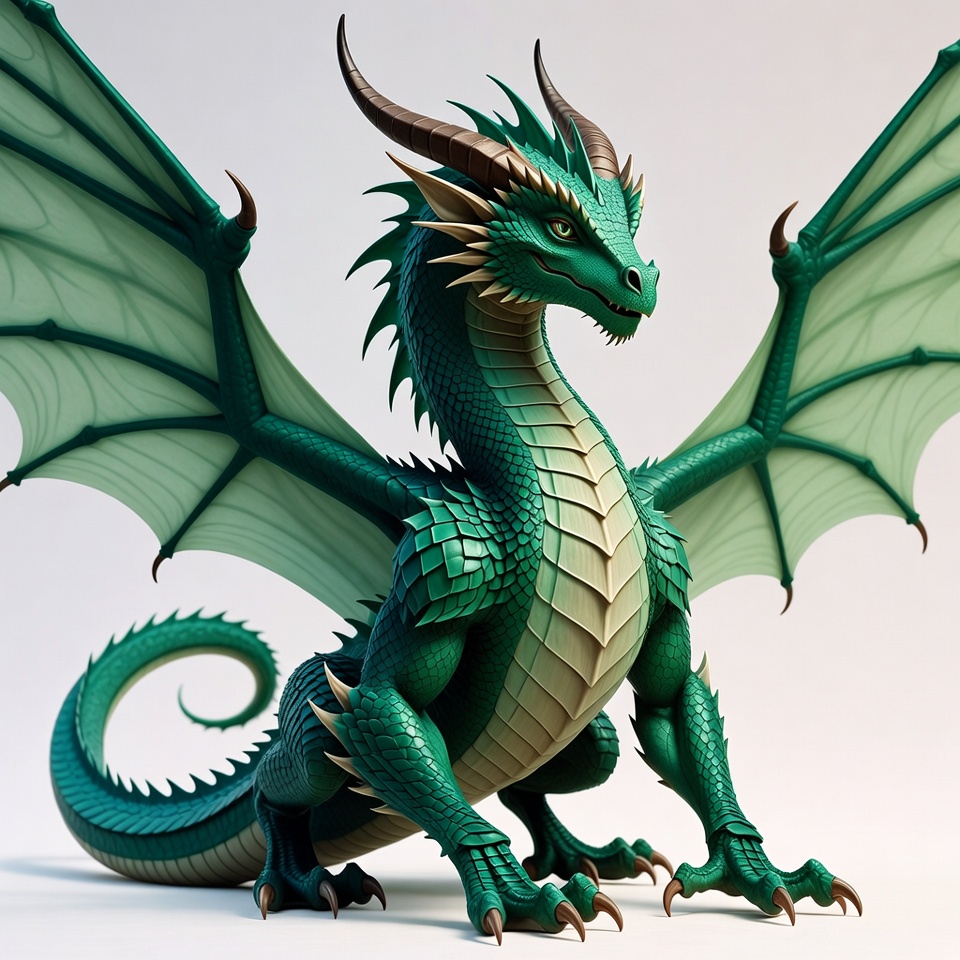 3D render, claws, crouching dragon, digital art, emerald dragon, fantasy creature, fierce dragon, green dragon, horns, illustration, isolated background, mythical beast, scales, wings, dragon