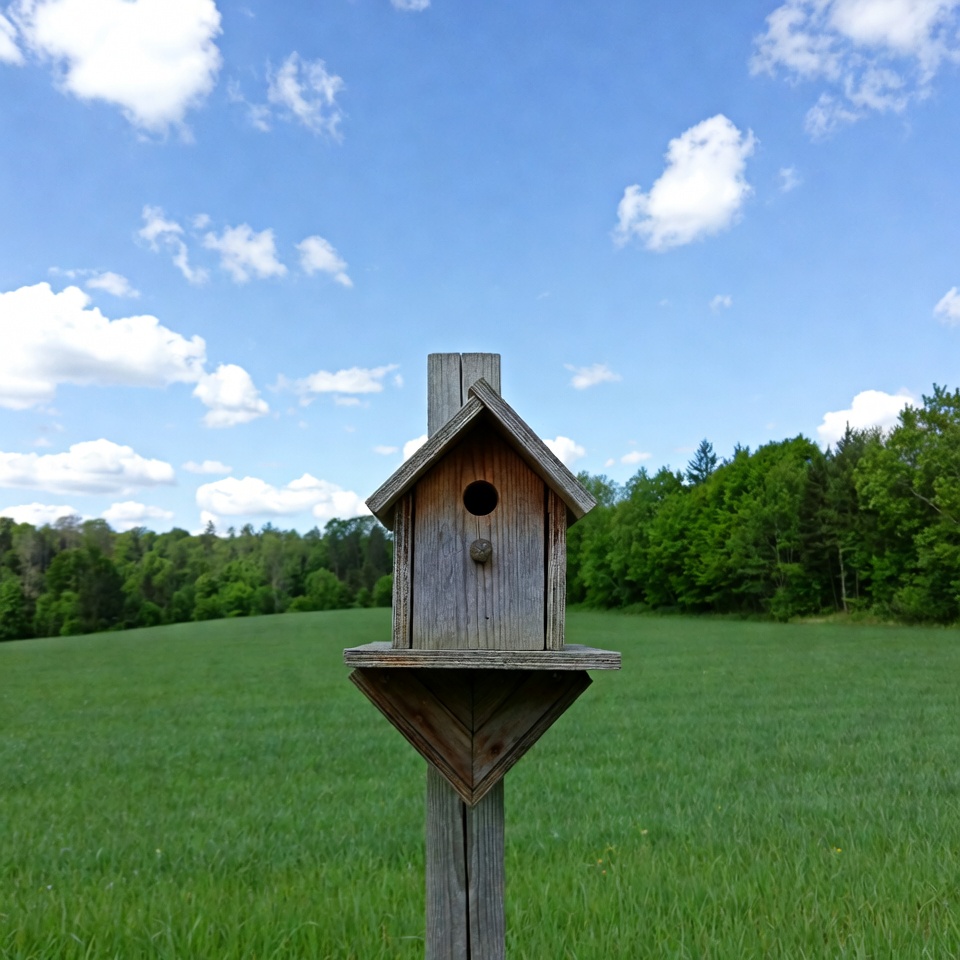 bird house, blue sky, countryside, forest, garden, grass, green field, habitat, isolated background, nature, outdoor, pole, post, rustic, sky, trees, weathered wood, white clouds, wildlife, wooden birdhouse, birdhouse