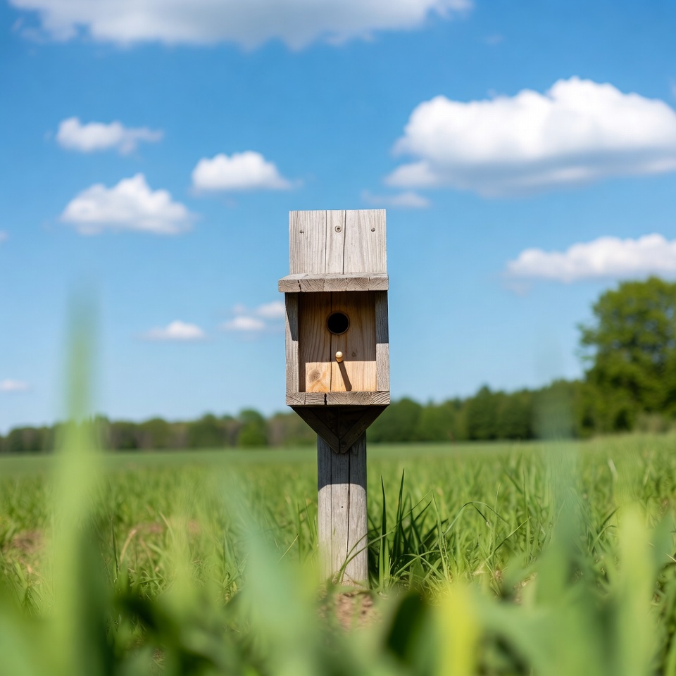bird box, birds, blue sky, clouds, field, garden, grass, green grass, isolated background, nature, nest box, outdoor, rural, sky, spring, summer, weathered wood, white clouds, wildlife, wooden birdhouse, wooden post, birdhouse