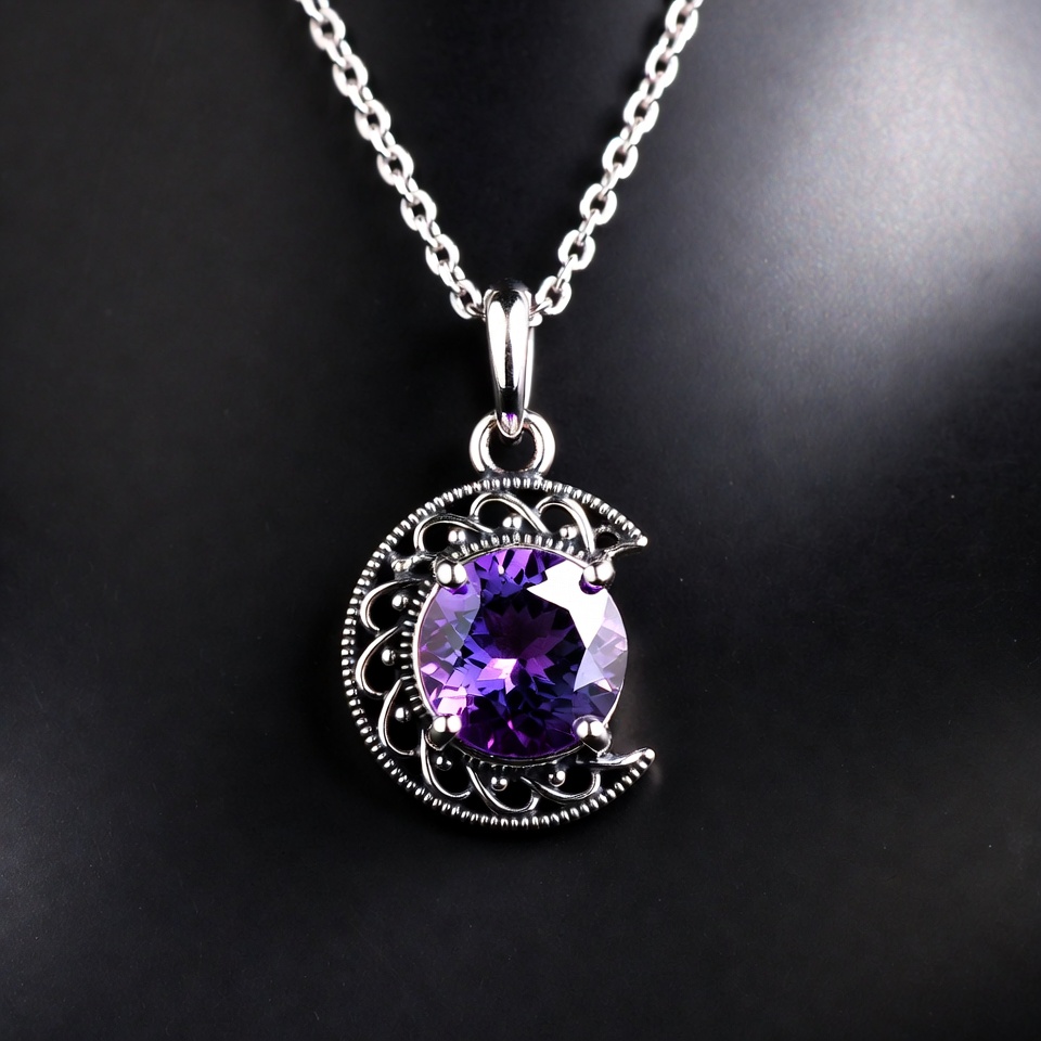 amethyst, crescent moon, filigree, gemstone, isolated background, jewelry, moon jewelry, moon pendant, pendant, purple amethyst, purple gem, silver chain, sterling silver, necklace