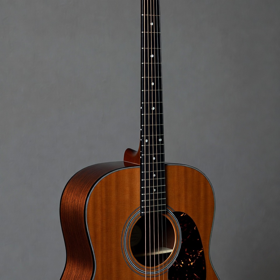 dreadnought guitar, fretboard, frets, guitar, guitar neck, isolated background, music instrument, musical instrument, natural wood, pickguard, sound hole, strings, wooden guitar, acoustic guitar