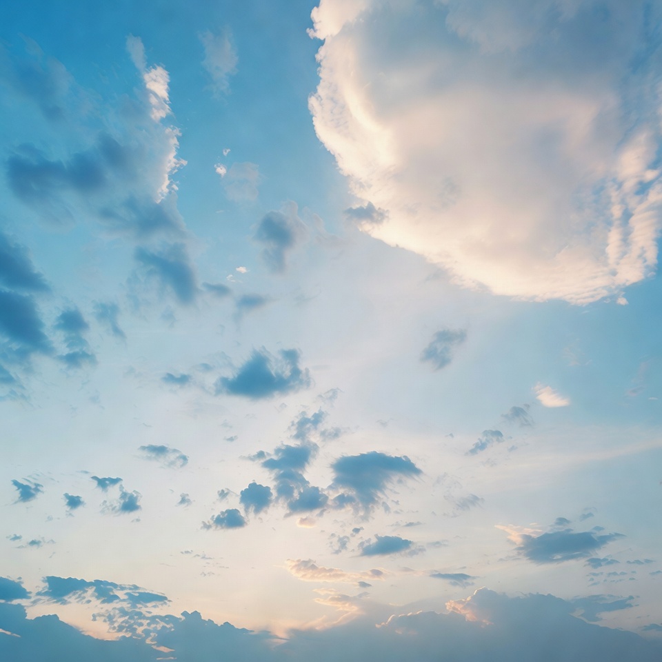 A bright blue sky filled with scattered white and fluffy clouds. A large prominent cloud dominates the upper portion, with smaller clouds dispersed throughout. The scene has a serene, open atmosphere with subtle sunlight highlighting the edges.