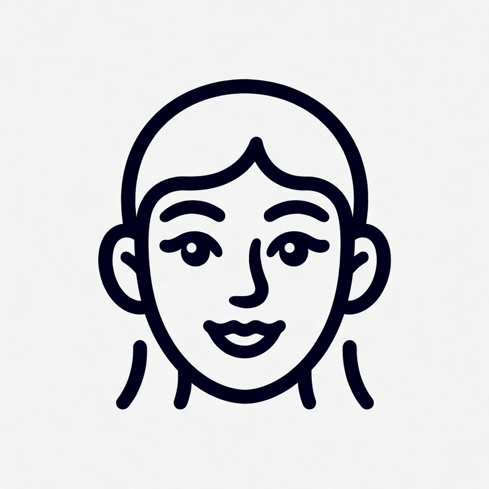 black lines, cartoon, clipart, emoji style, eyes, face, female, graphic, happy expression, head, icon, illustration, isolated background, line art, mouth, nose, portrait, short hair, simple, smiling, vector, woman