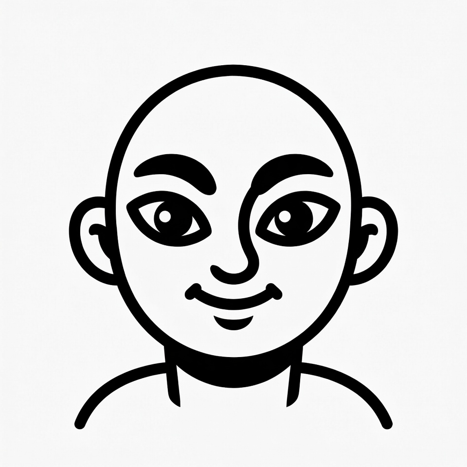 Asian, bald head, black and white, cartoon face, clipart, expressive eyes, eyebrows, friendly expression, happy face, illustration, isolated background, line art, male, man, nose, simple illustration, smile, smiling man, vector art, bald man