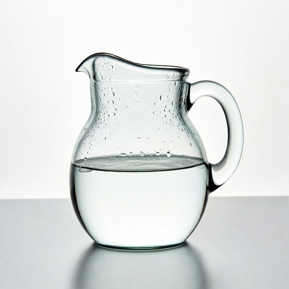 beverage container, bubbles, clear glass, drinking water, handle, isolated background, jug, kitchenware, liquid, pitcher, product photo, spout, table, textured glass, transparent, water, water pitcher, white background, glass pitcher