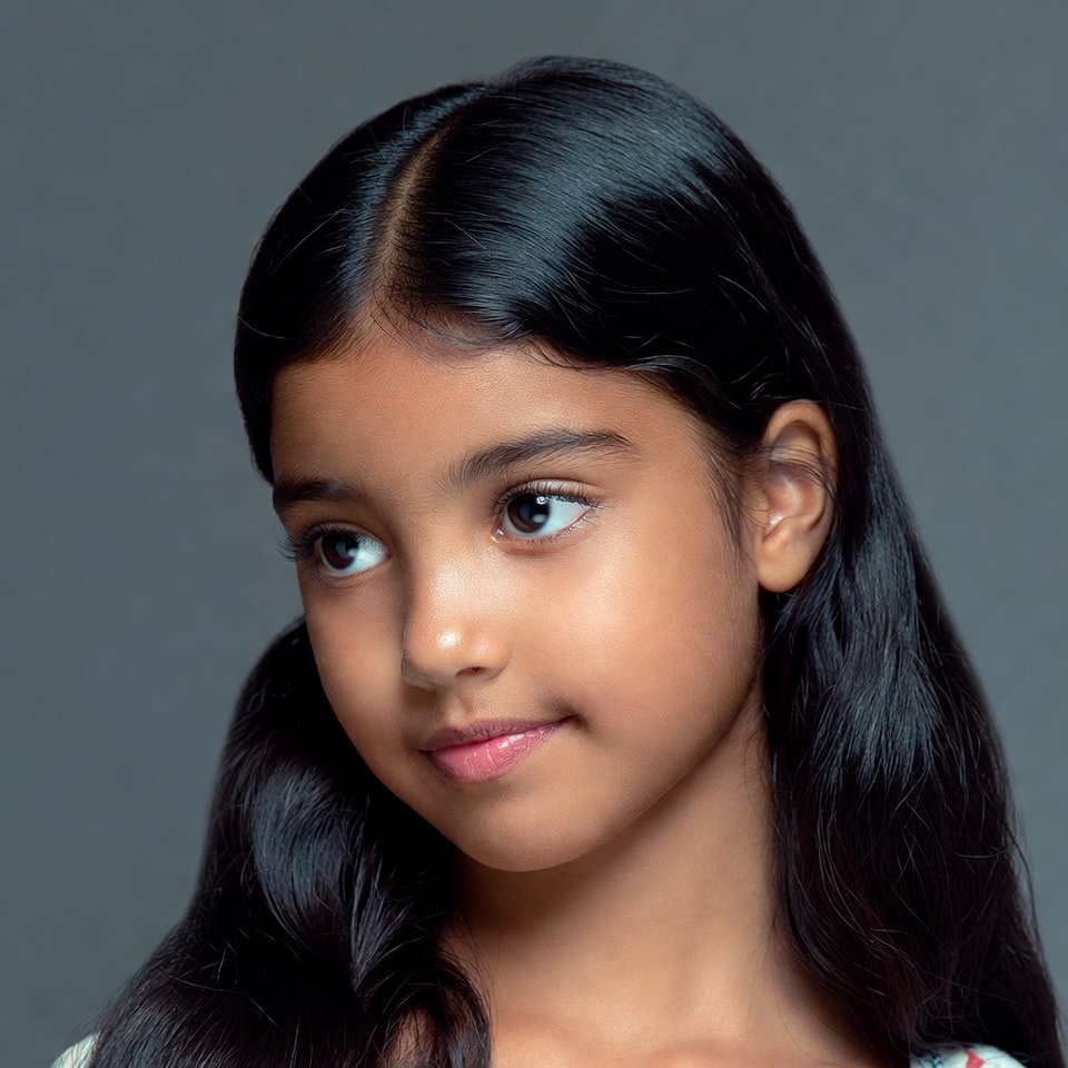 A young Indian girl with long straight black hair looks sideways with a gentle smile. Her large brown eyes are expressive, and she has smooth brown skin. The image is a close-up portrait against a plain gray background.