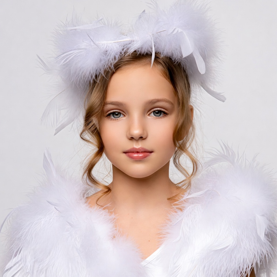 A young girl with curly blonde hair wears a large white feathered headband on her head. She has blue eyes, pink lips, and gazes directly at the camera. She is dressed in a fluffy white feathered outfit against a plain white background.