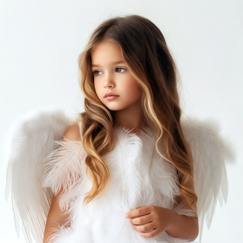 A young girl with long wavy brown hair and highlights stands against a white background. She wears a white feathered dress and large white angel wings attached to her back. She holds a white feather in her hand and gazes thoughtfully to the side.