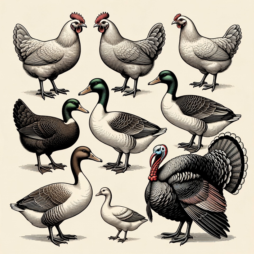 A collection of farm birds including multiple white chickens with red combs stands on a plain background. Various ducks in white, brown, and green-headed varieties are depicted alongside them. A large turkey with red wattle and tail feathers completes the group in this detailed line art illustration.
