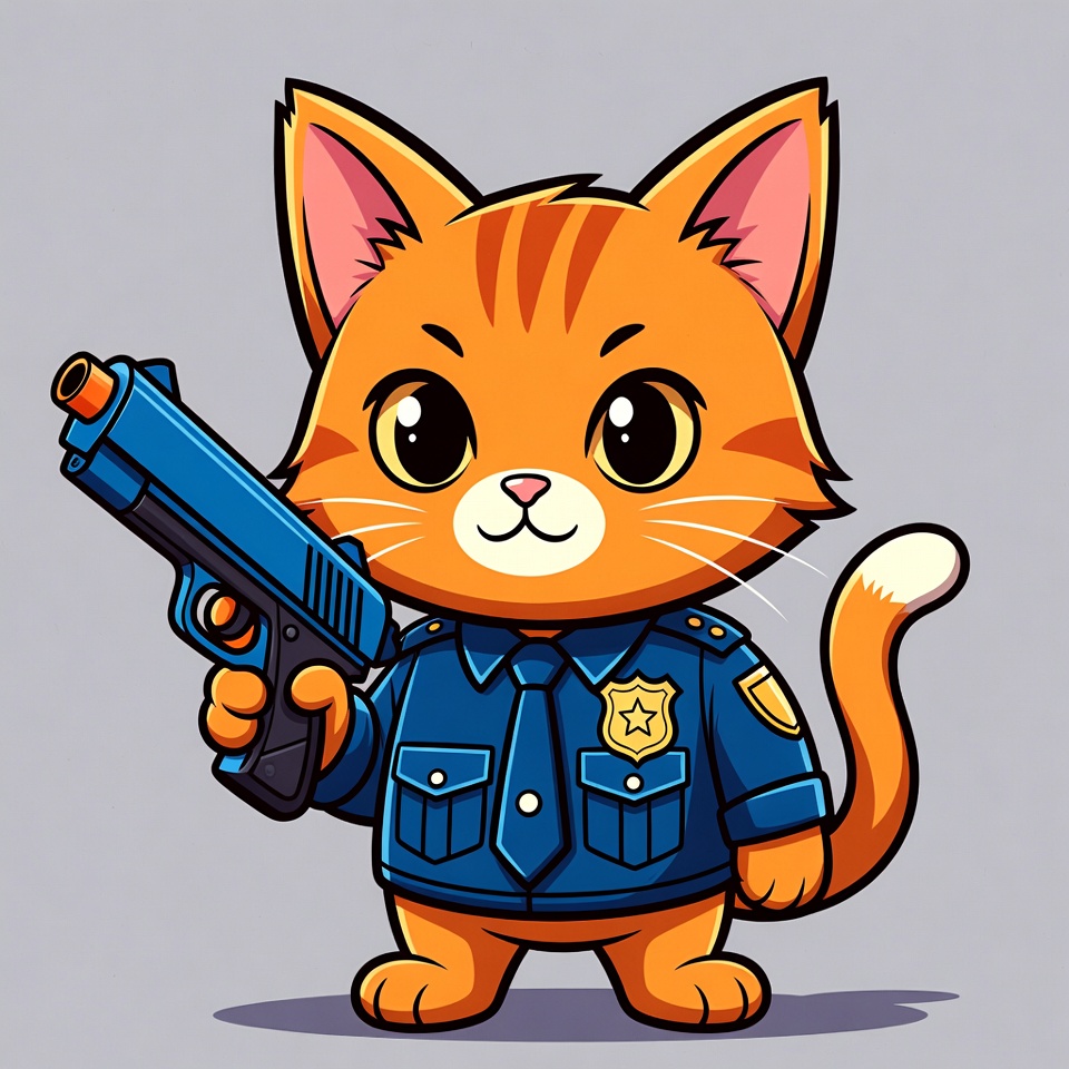 A cute cartoon orange tabby cat dressed in a blue police uniform holds a blue toy gun with both paws. The cat has a stern expression with large eyes and wears a police badge on its chest. It stands on a plain gray background.
