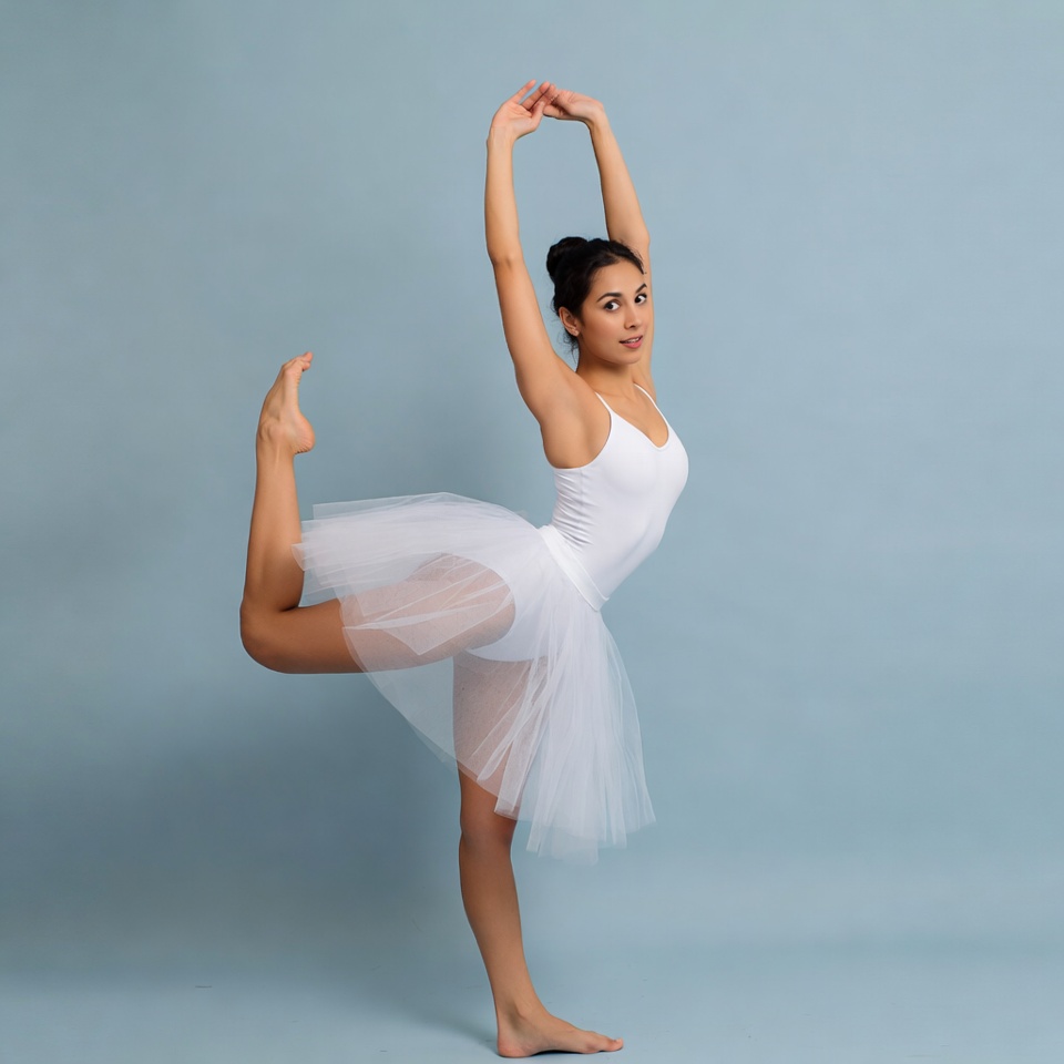 A young Latina woman in a white tutu leotard performs a ballet pose on one leg. She raises both arms gracefully overhead with one foot lifted high behind her. She stands against a solid light blue background.