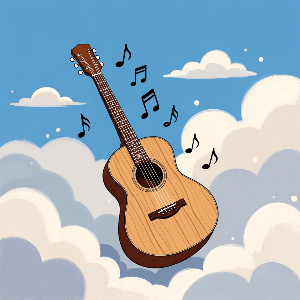 A wooden acoustic guitar floats in a bright blue sky surrounded by fluffy white clouds. Musical notes drift around the guitar, enhancing the whimsical scene. The guitar features a natural wood finish with detailed strings and tuning pegs.