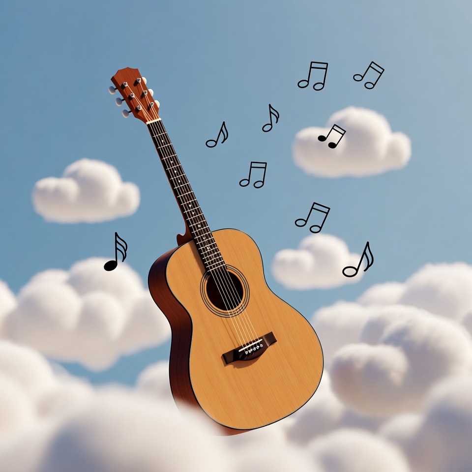 A wooden acoustic guitar floats against a bright blue sky filled with fluffy white clouds. Black musical notes surround the guitar, drifting playfully around it. The scene has a whimsical, 3D rendered illustration style.
