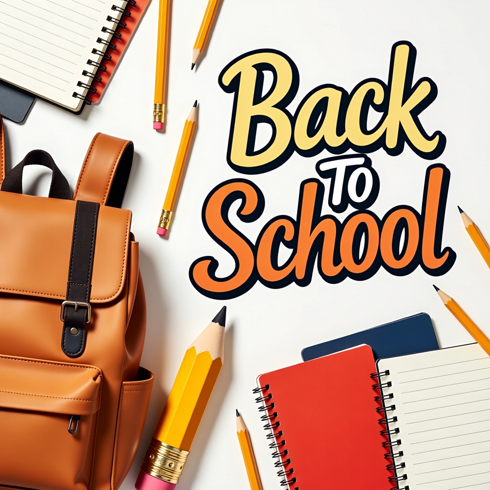 A flat lay composition on a white background features a brown leather backpack, assorted spiral notebooks in white, red, and blue, and various yellow pencils. Bold orange and yellow text reads 'Back to School' prominently in the center. The items are arranged neatly around the text for a vibrant school-themed display.