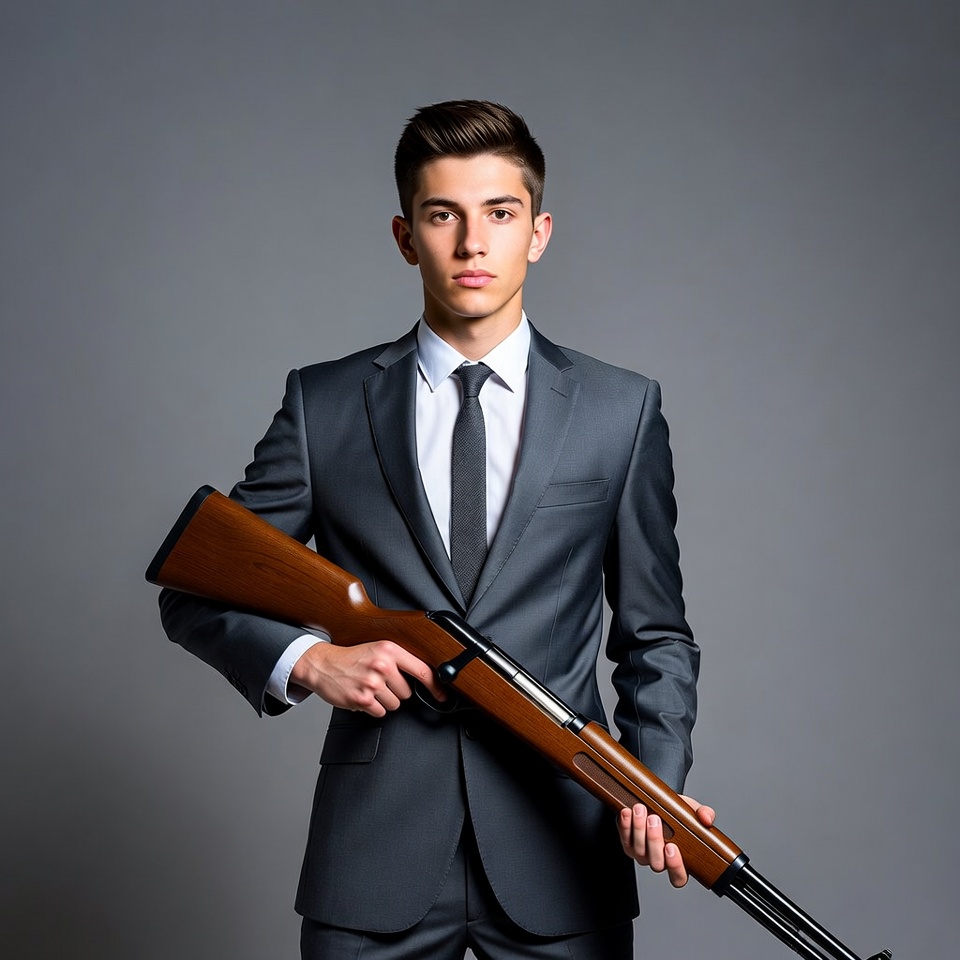A young man with short dark hair stands confidently against a gray background, dressed in a dark gray suit, white shirt, and black tie. He holds a wooden-stock rifle with both hands across his chest. His expression is serious and direct gaze at the camera.
