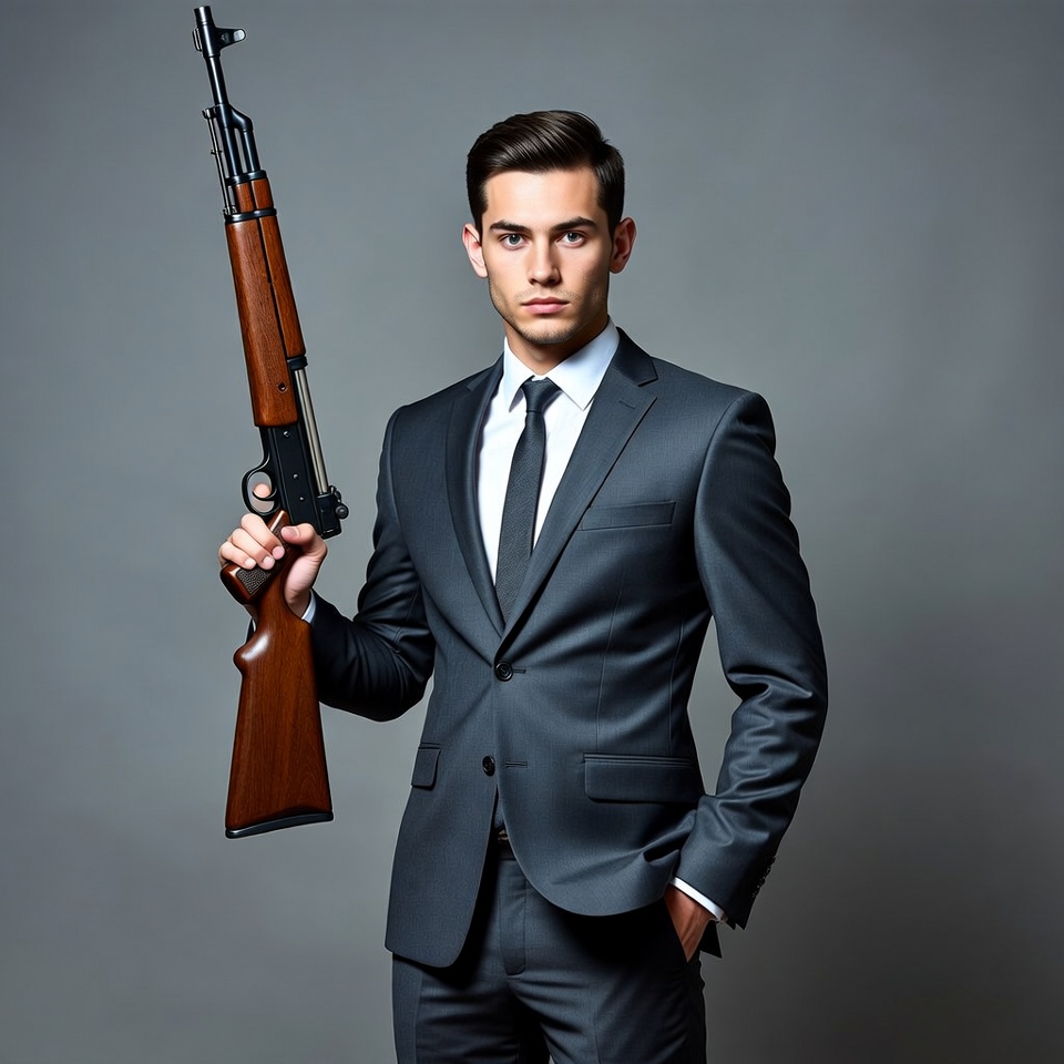 A young man with short dark hair stands confidently holding a wooden shotgun over his shoulder. He wears a dark gray suit, white shirt, and black tie against a plain gray background. His expression is serious with hands gripping the weapon.