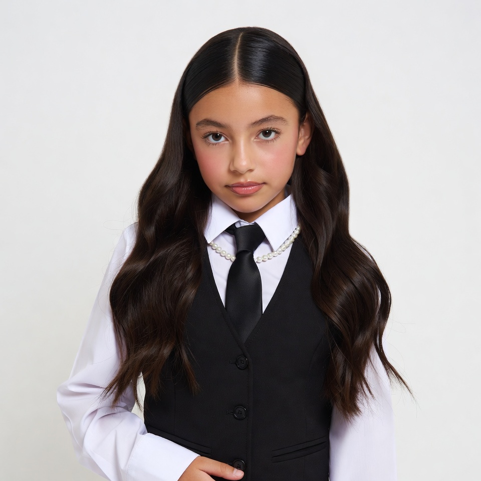 A young girl with long dark wavy hair stands against a white background. She wears a white dress shirt, black tie, black vest, and a pearl necklace. Her expression is neutral with hands positioned at her sides.