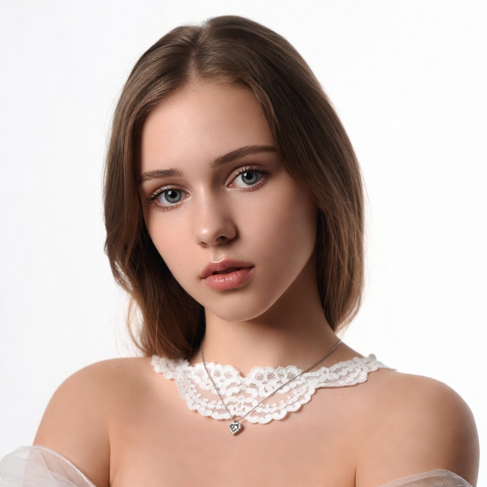 A young woman with long brown hair and blue eyes gazes at the camera against a white background. She wears a delicate silver necklace with a heart pendant and intricate white lace choker. Her shoulders are bare, framed by sheer white off-shoulder fabric.