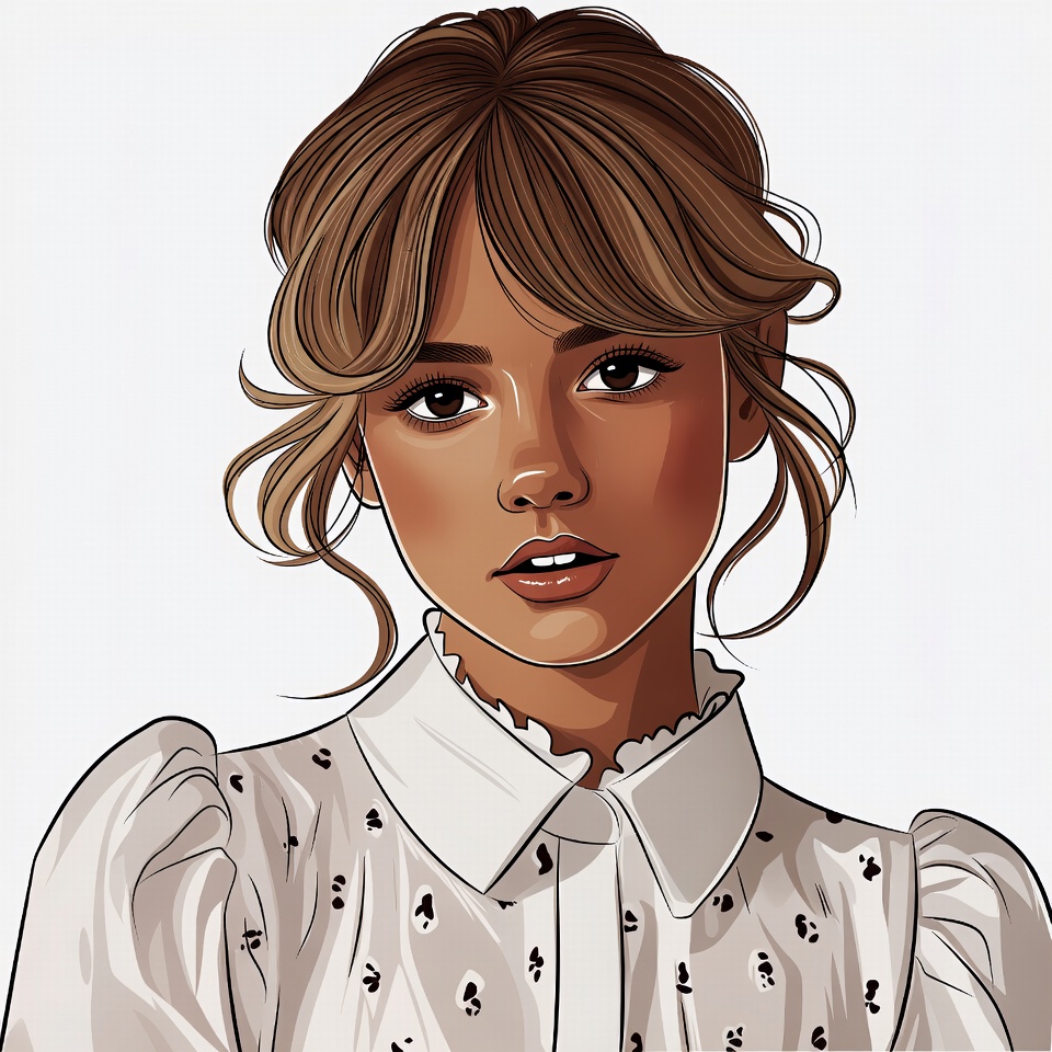 A young woman with wavy brown hair and warm skin tone gazes forward with a slight smile. She wears a white collared blouse with puffed sleeves and ruffled details. The illustration is set against a plain white background.