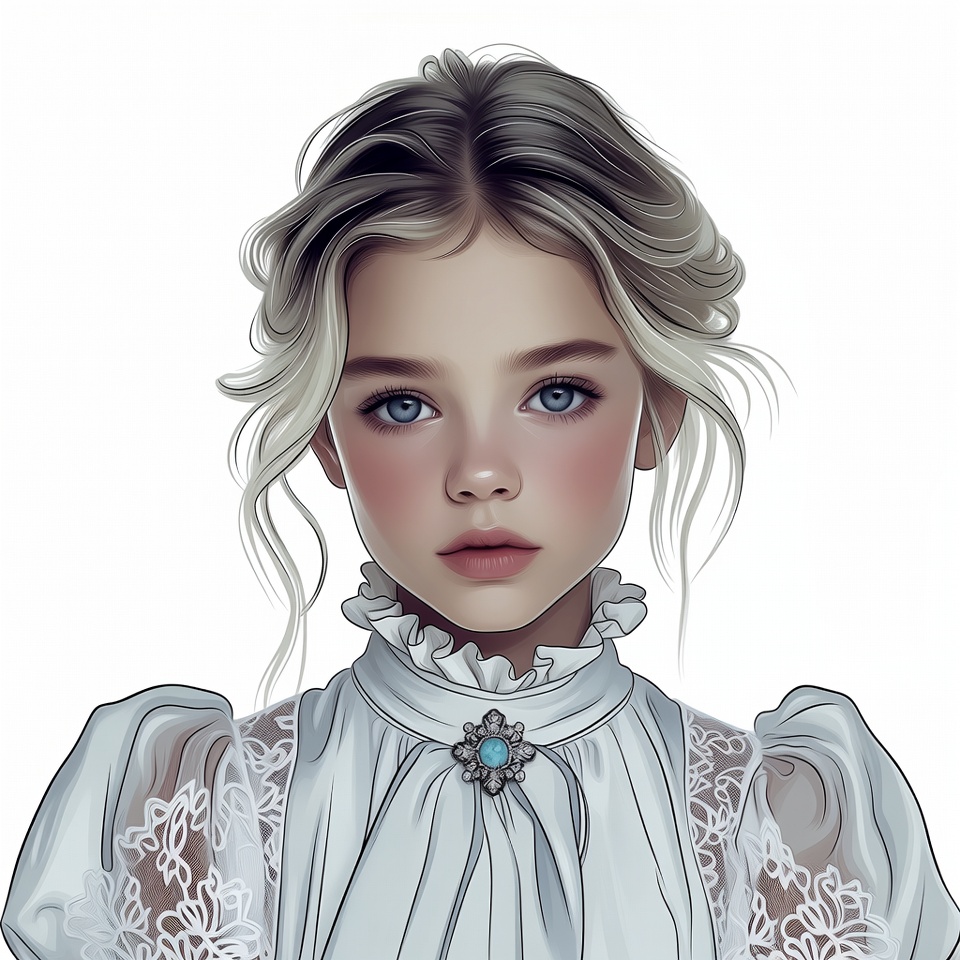 Victorian blouse, White, blue eyes, blush cheeks, digital art, fair skin, female, illustration, isolated background, lace collar, platinum blonde hair, portrait, puffed sleeves, ruffled neckline, turquoise brooch, updo hairstyle, wavy hair, white clothing, young girl, girl