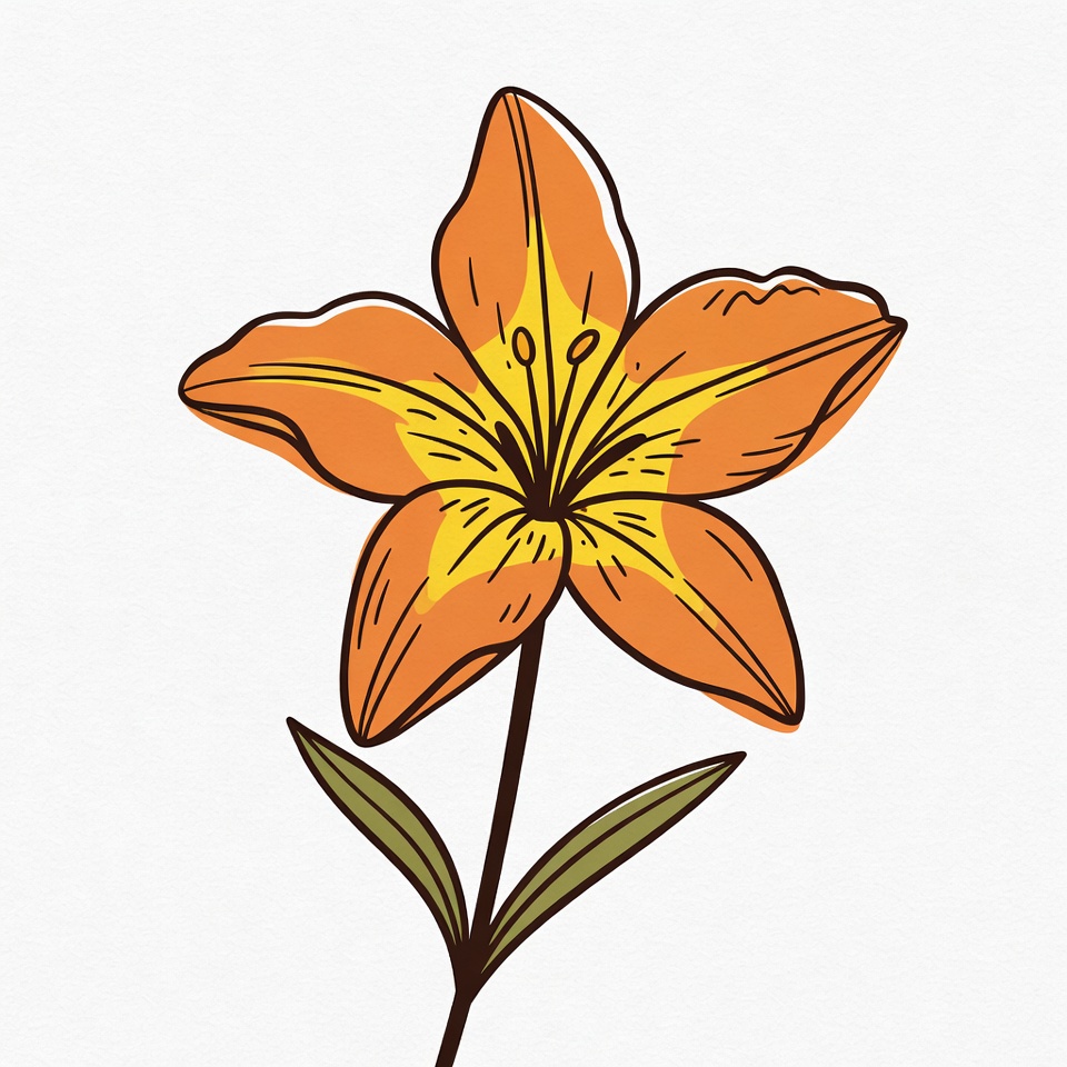 A vibrant orange lily flower illustration features six curved petals with yellow highlights and dark centers. The flower sits atop a slender green stem with a pair of leaves. It is rendered in a simple line art style on a white background.
