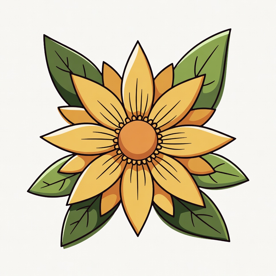 bold colors, cartoon flower, clipart, daisy-like flower, floral design, flower center, flower illustration, graphic flower, green leaves, isolated background, nature illustration, petals, vector flower, yellow flower, sunflower