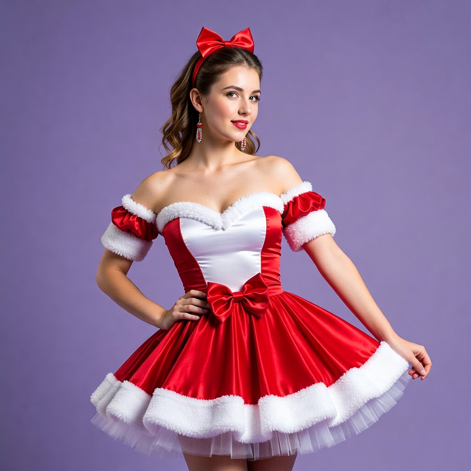Christmas dress, Santa costume, White, bow headband, female, festive clothing, gold earrings, holiday attire, off-shoulder, posing woman, puffy sleeves, purple background, red dress, satin dress, sexy outfit, short dress, wavy hair, white fur, young woman, woman