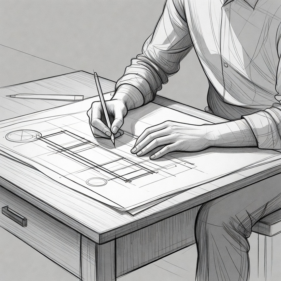 A man in a white shirt sits at a wooden desk, sketching on a large blueprint with a pencil. Detailed line drawings of building plans cover the paper, with additional pencils nearby. His sleeves are rolled up as he focuses on the architectural design.
