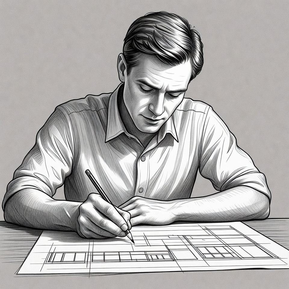 A man with short dark hair sits at a table, intently drawing on a large architectural blueprint with a pencil. He wears a white collared shirt with rolled sleeves and focuses on detailed line work. The image is rendered in detailed pencil sketch style on a light gray background.