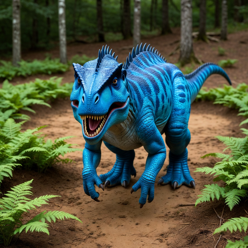 A large blue Spinosaurus dinosaur with a prominent sail and sharp teeth roars while standing on a dirt path in a dense forest. It has blue skin with darker stripes and is surrounded by green ferns and birch trees. The dinosaur appears realistic and detailed against the natural woodland background.