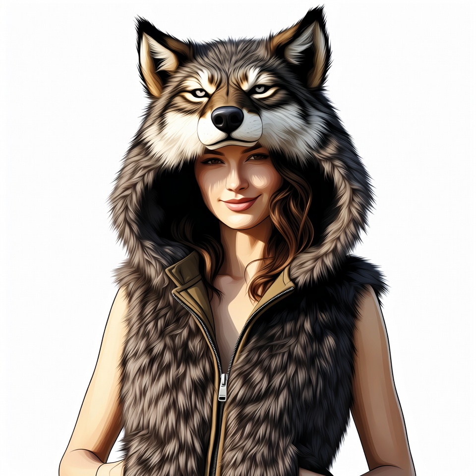 White, animal hood, brown hair, digital art, female, fur hood, furry costume, gray wolf, illustration, isolated background, leather vest, portrait, smiling woman, wolf head, wolf hood, wolf mask, young woman, woman