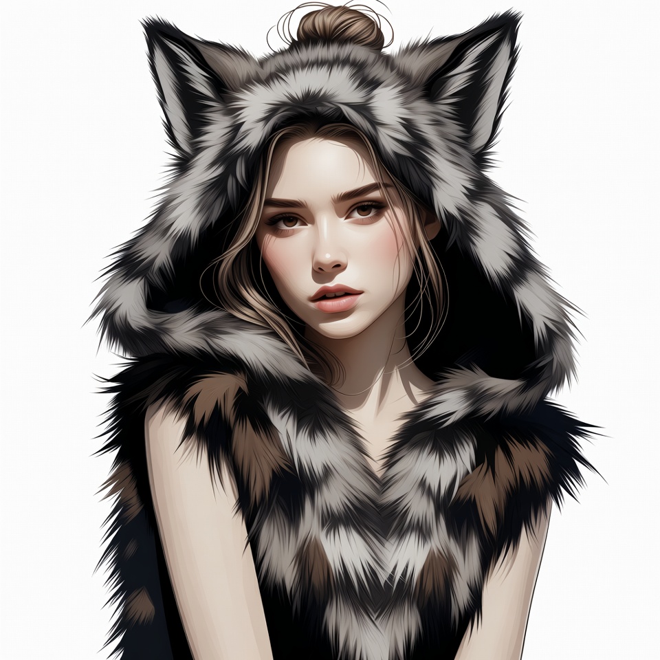 A young woman with long brown hair wears a detailed gray wolf fur hood and hood with large fluffy ears. She has a serene expression with subtle makeup and gazes forward. The illustration is on a white isolated background.