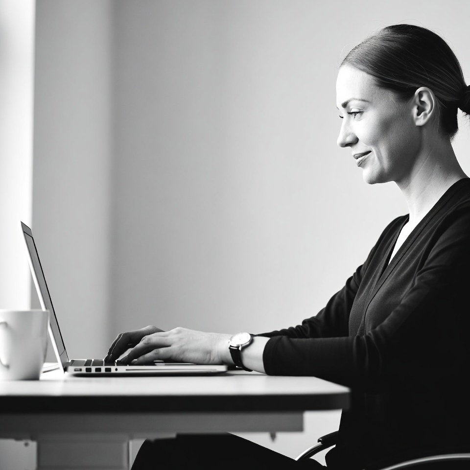 A woman with her brown hair in a bun sits at a desk typing on a laptop computer. She wears a black long-sleeved top and a wristwatch, with a white mug nearby. The black and white image shows her smiling slightly while focused on her work near a window.