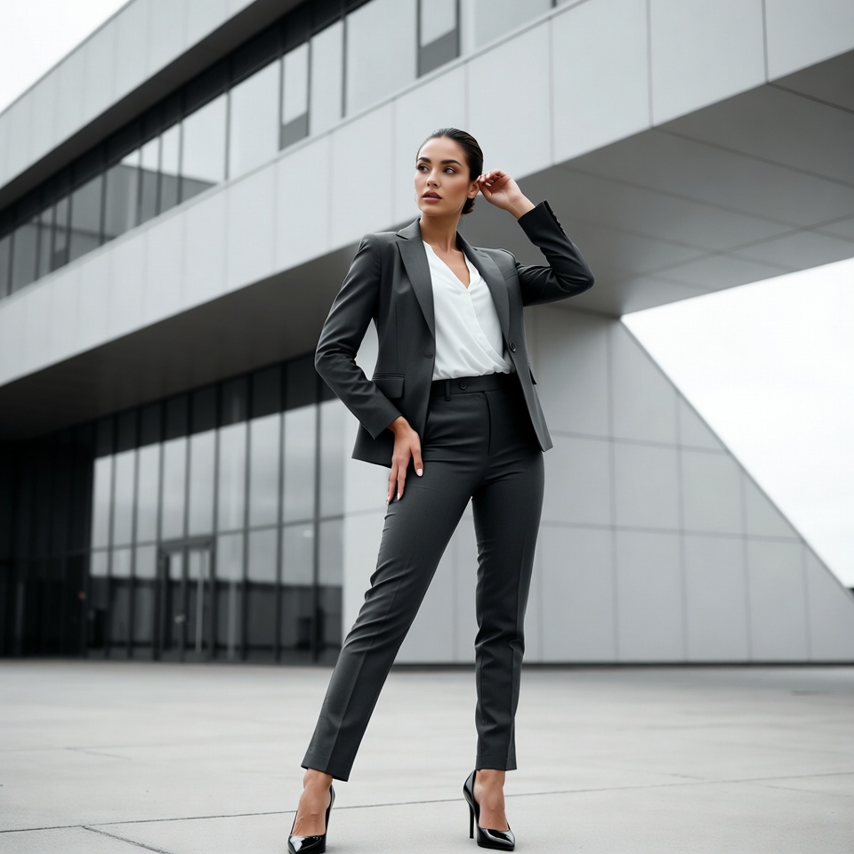A young woman with dark hair stands confidently in front of a large modern building with gray glass and concrete architecture. She wears a tailored gray blazer, white blouse, matching gray pants, and black high heels, posing with one hand touching her hair. The outdoor setting features a concrete pavement and overcast sky.