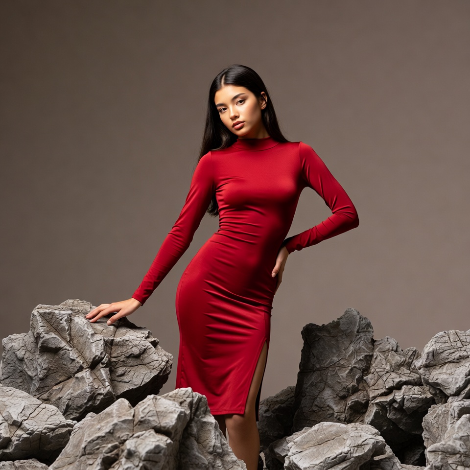 A young Asian woman with long dark hair poses confidently on a pile of large gray rocks. She wears a form-fitting red long-sleeve dress with a high neckline and side slit. Her hand rests on the rocks while she stands with one hip cocked against a neutral background.