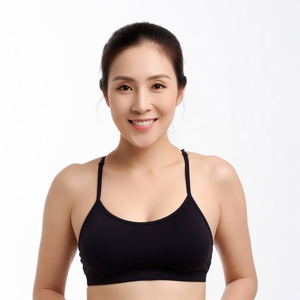 A young Asian woman with dark hair tied in a bun smiles at the camera against a white background. She wears a black spaghetti-strap sports bra that accentuates her figure. Her expression is friendly and confident.