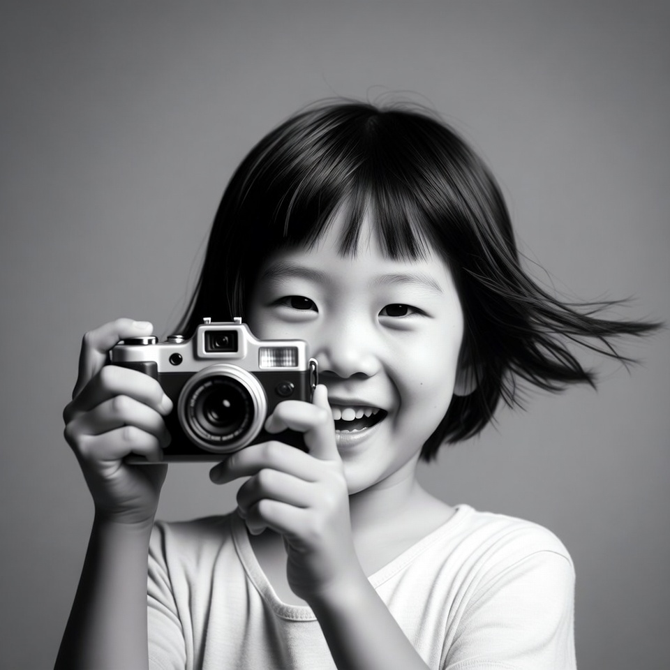 A young Asian girl with straight black hair and bangs smiles happily while holding a classic silver film camera in both hands. She wears a simple white shirt and stands against a plain gray background. Her eyes are wide open with joy, and her hair slightly blows in the wind.