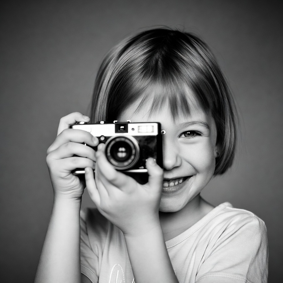 A young girl with blonde bob haircut smiles happily while holding a black and white vintage camera up to her face. She wears a light-colored shirt and stands against a plain gray background. Her eyes peek over the camera as she grips it with both hands.