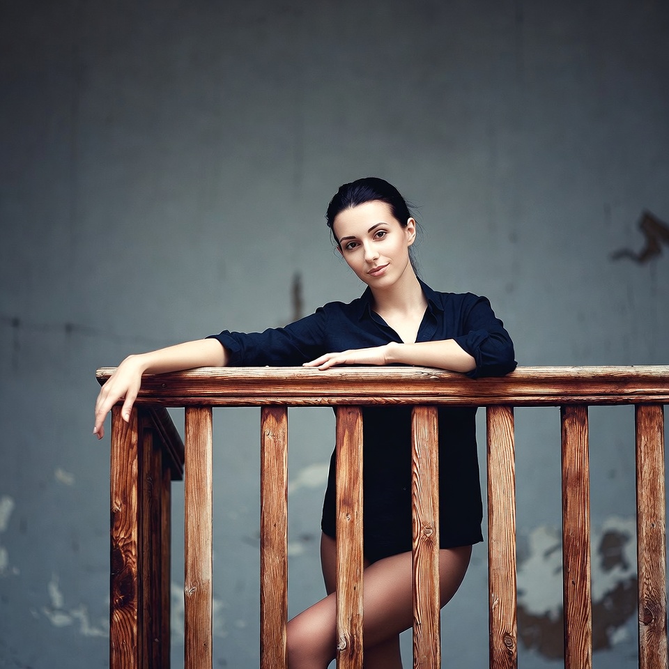 White, attractive woman, balustrade, bare legs, black shirt, casual pose, dark hair, deck railing, extended leg, female, gray wall, industrial background, leaning pose, one person, portrait, rolled sleeves, smiling, studio photo, wooden railing, young woman, woman