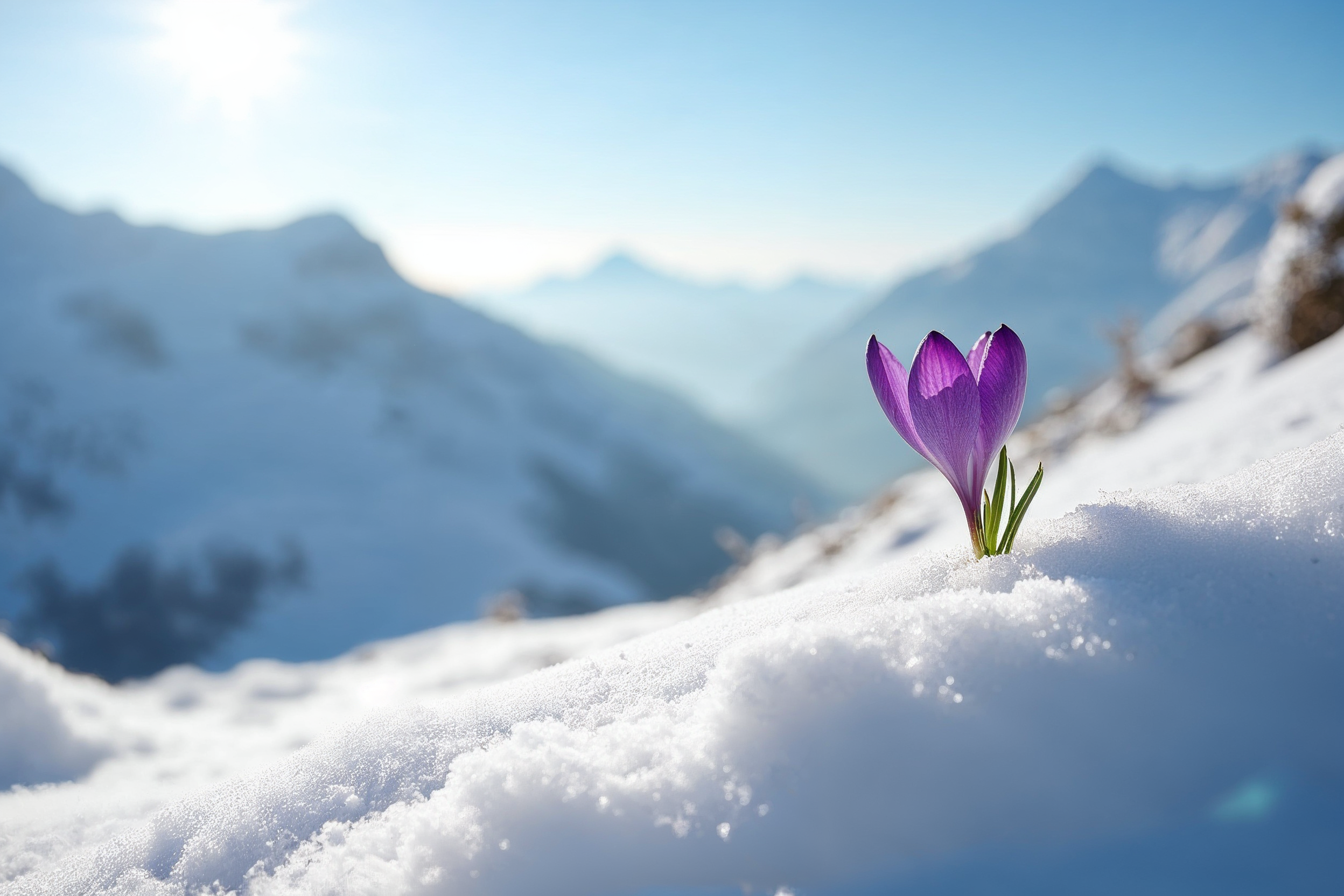 alpine flower, blooming crocus, blue sky, crocus flower, flower, isolated flower, macro flower, mountain landscape, mountains, nature, purple crocus, purple flower, snow, snow flower, snowy mountains, spring crocus, sunlight, white snow, winter flower, crocus