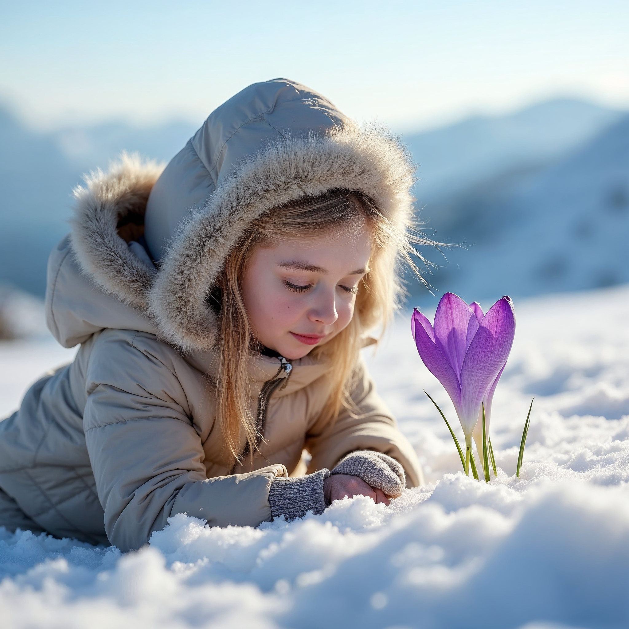 A young blonde girl in a beige fur-lined hooded jacket kneels on the snow-covered ground, gently touching a vibrant purple crocus flower emerging from the snow. Snowy mountains rise in the background under a clear blue sky. She has a focused expression as she examines the flower closely.