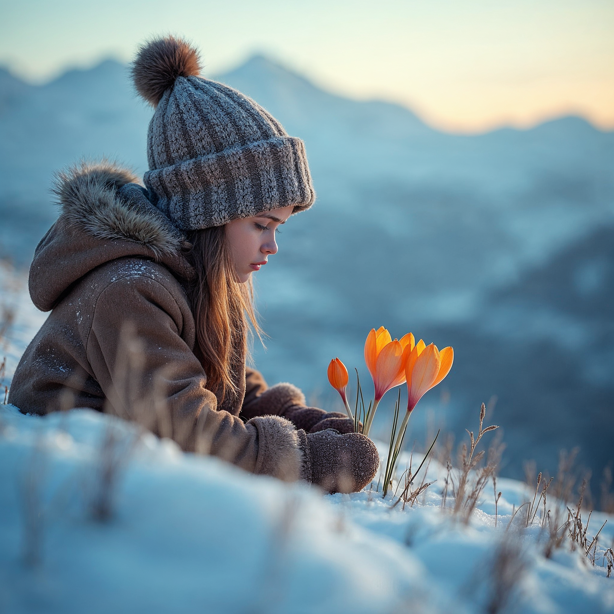 A young girl with long brown hair wears a knitted beanie and fur-trimmed brown jacket while kneeling in snow. She gently holds and smells vibrant orange crocus flowers growing through the snow. Snowy mountain peaks and a sunset sky form the background.